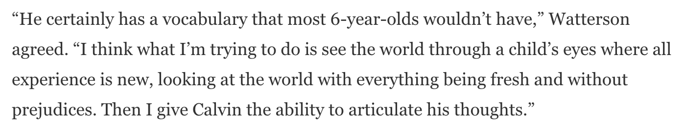 To sum up Calvin, I found a newspaper clipping from an interview with Bill Waterson. He says,