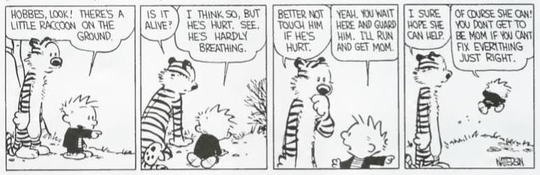 The first row ends with Calvin running off to get his mom. Hobbes expresses a wish that she can help, to which Calvin says, “Of course she can! You don’t get to be a mom if you can’t fix everything just right!”